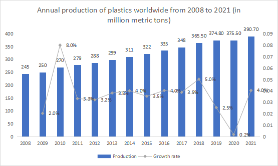 图2:2008-2021全球塑料产量及增长率